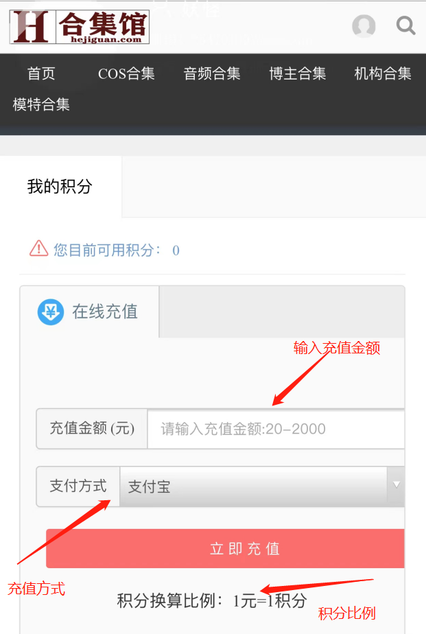 自由选择支付方式,输入金额即可(比例1元=1积分)